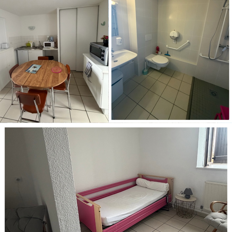 Studio deux places PMR de 30 m2. Kitchenette, salle d’eau PMR, ouvert sur le jardin ombragé. Pour une halte seul(e) ou en couple, pour se ressourcer Pour ceux qui aiment marcher, l’accès aux sentiers est à deux pas.