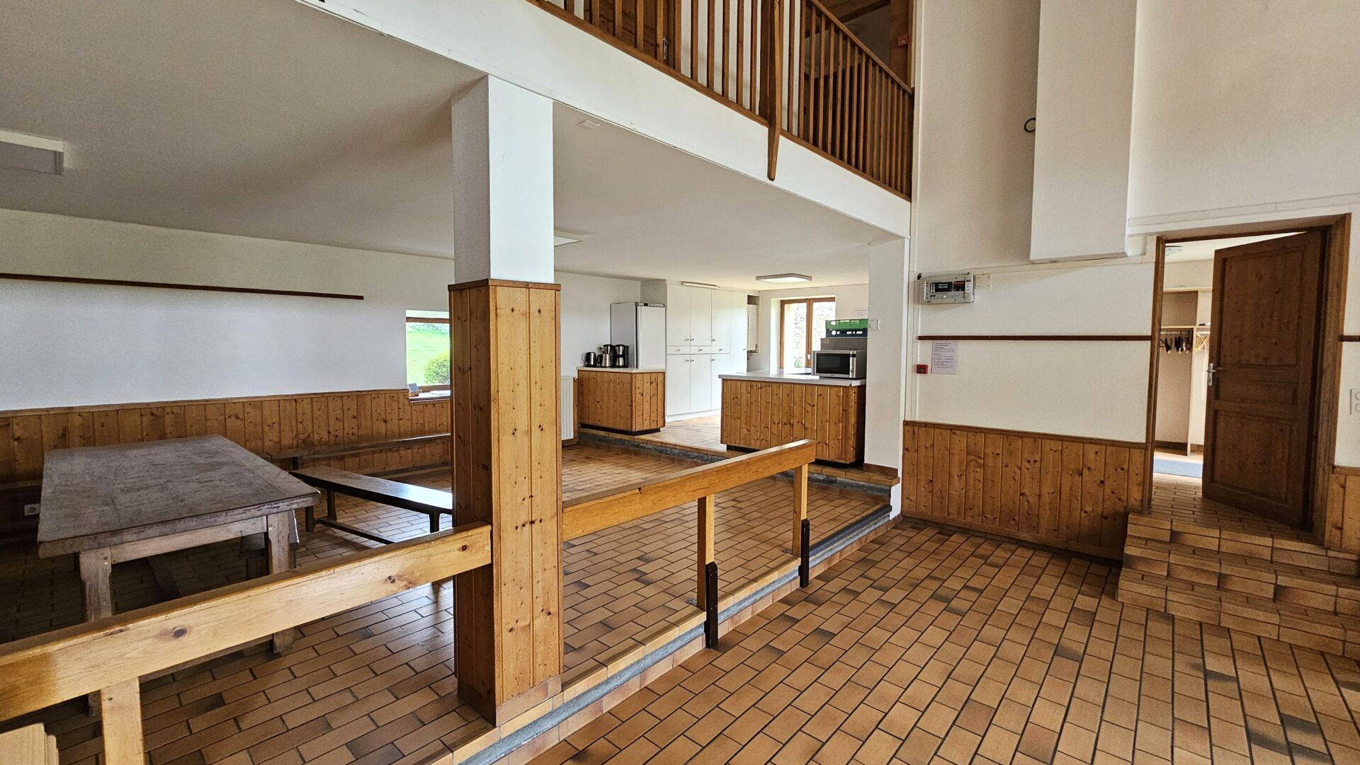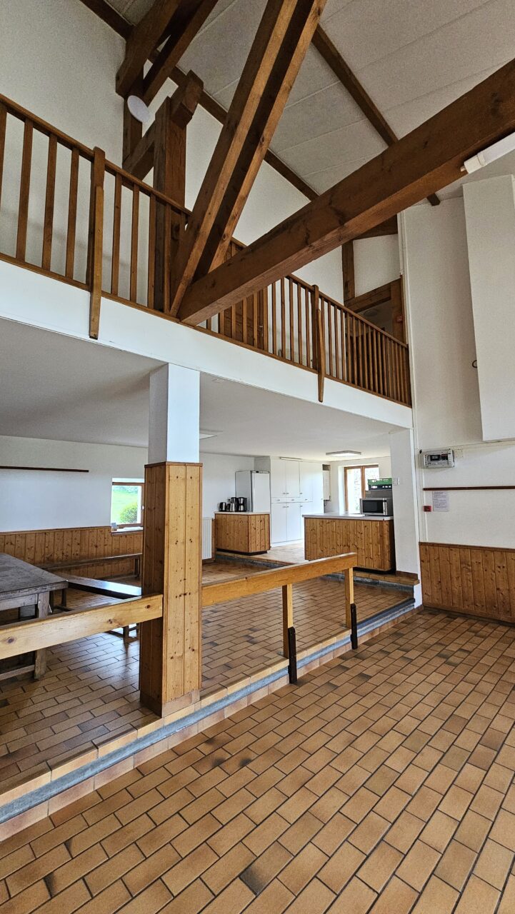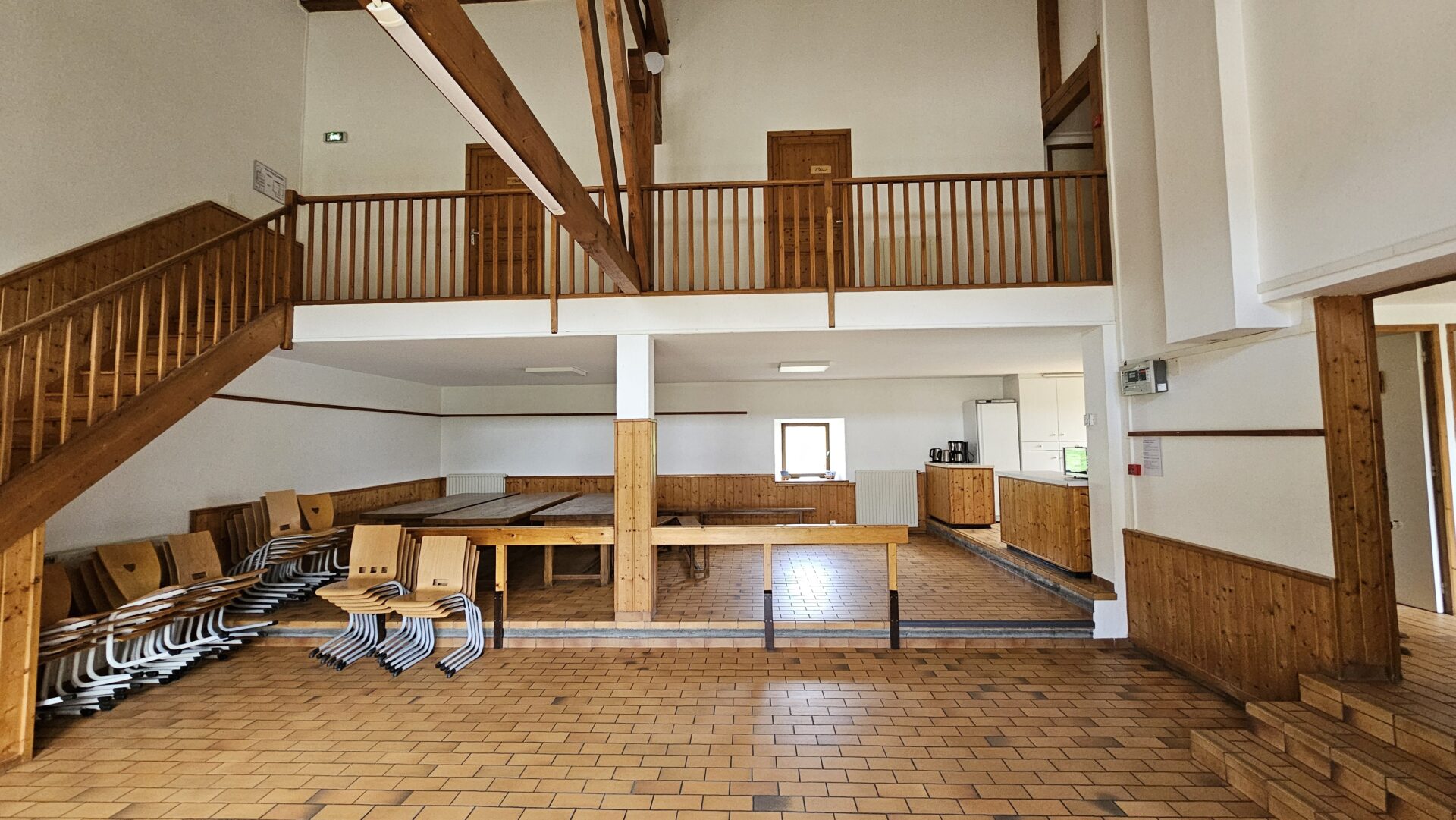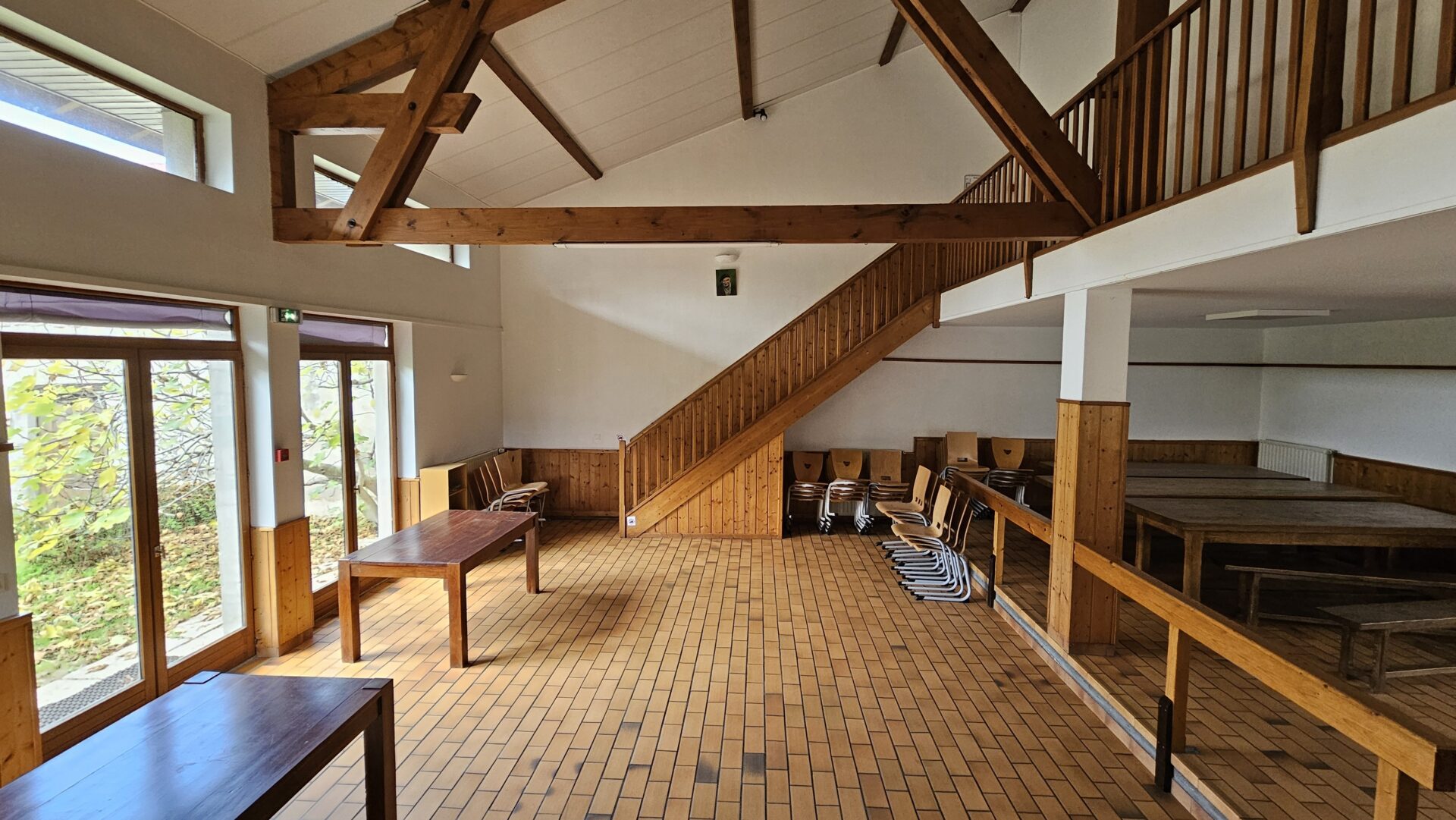 Ancienne grange rénovée, la Maison Marcel Légaut possède en rez-de-chaussée une grande salle très lumineuse de 84 m2 équipée de 3 tables en bois massif pour 10 personnes, 6 bancs, 2 tables de 6, une quarantaine de chaises (tables et bancs en supplément sur demande), avec cuisine attenante, entièrement équipée: cuisinière, lave-vaisselle, réfrigérateur, vaisselle en quantité pour accueillir jusqu’à 50 personnes pour des réceptions, des réunions ou des conférences.