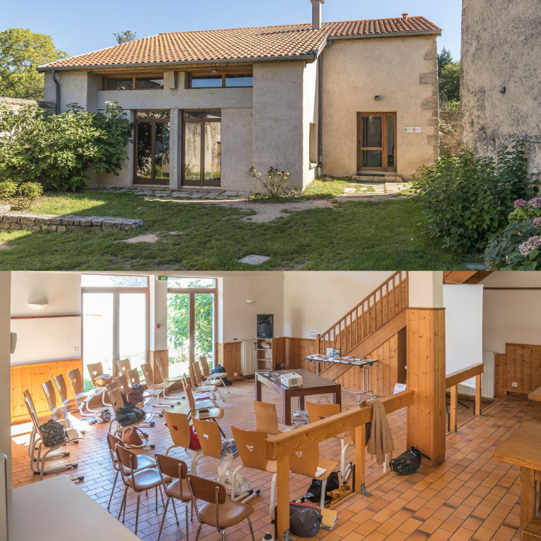 Ancienne grange rénovée, la Maison Marcel Légaut possède en rez-de-chaussée une grande salle très lumineuse de 84 m2 équipée de 3 tables en bois massif pour 10 personnes, 6 bancs, 2 tables de 6, une quarantaine de chaises (tables et bancs en supplément sur demande), avec cuisine attenante, entièrement équipée: cuisinière, lave-vaisselle, réfrigérateur, vaisselle en quantité pour accueillir jusqu’à 50 personnes pour des réceptions, des réunions ou des conférences.